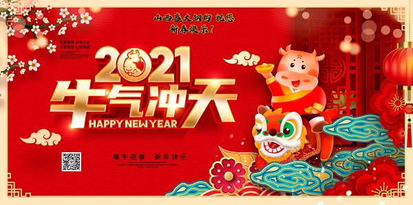 值此新春佳節到來之際,山西盛大鋼結構工程公司全體員工祝大家身體健康!新春大吉!愿大家歲歲常歡愉,年年皆勝意。2021牛氣沖天!
